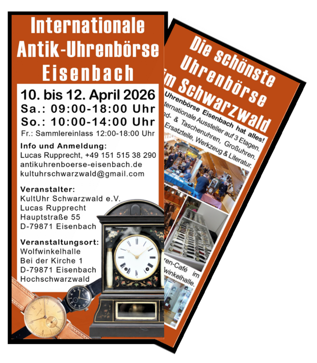 Die Schönste Uhrenbörse des Schwarzwalds!Rund 100 internationale Händler stellen alles zwischen Armband- und Kirchturmuhr aus, dazu Werkzeug, Ersatzteile und Restaurierungsbedarf. Die ruhige Atmosphäre auf 3 Etagen der großen Ausstellungshalle lädt zum Verweilen ein.Zu einer Pause verleiten warme und kalte Speisen günstig im Bistrobereich.Standaufbau möglich ab: